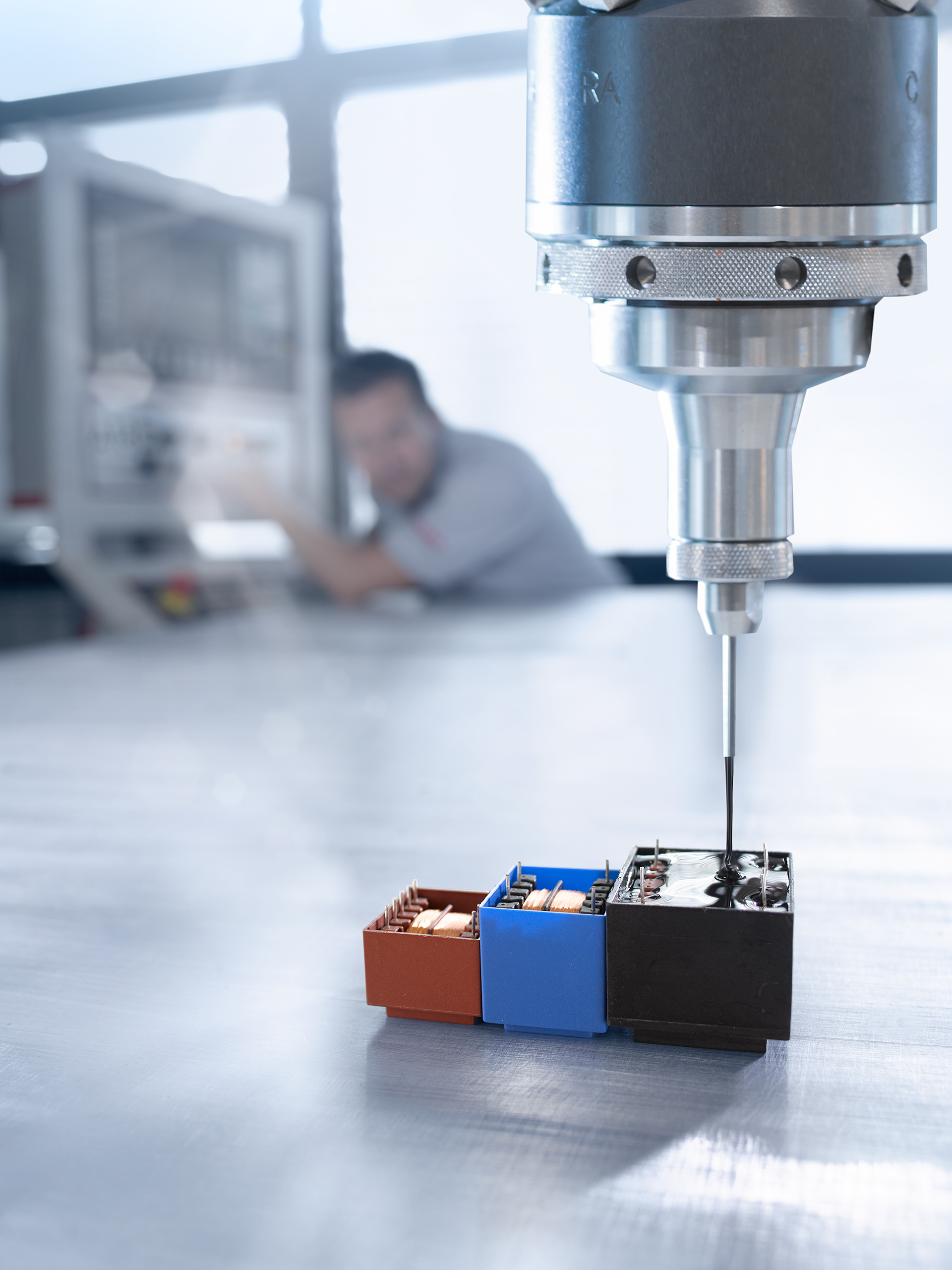Mit professionellen Misch- und Dosieranlagen wird die Vergussmasse exakt dosiert und gleichmäßig verteilt, um Hohlräume zu vermeiden und vollständigen Schutz zu gewährleisten.