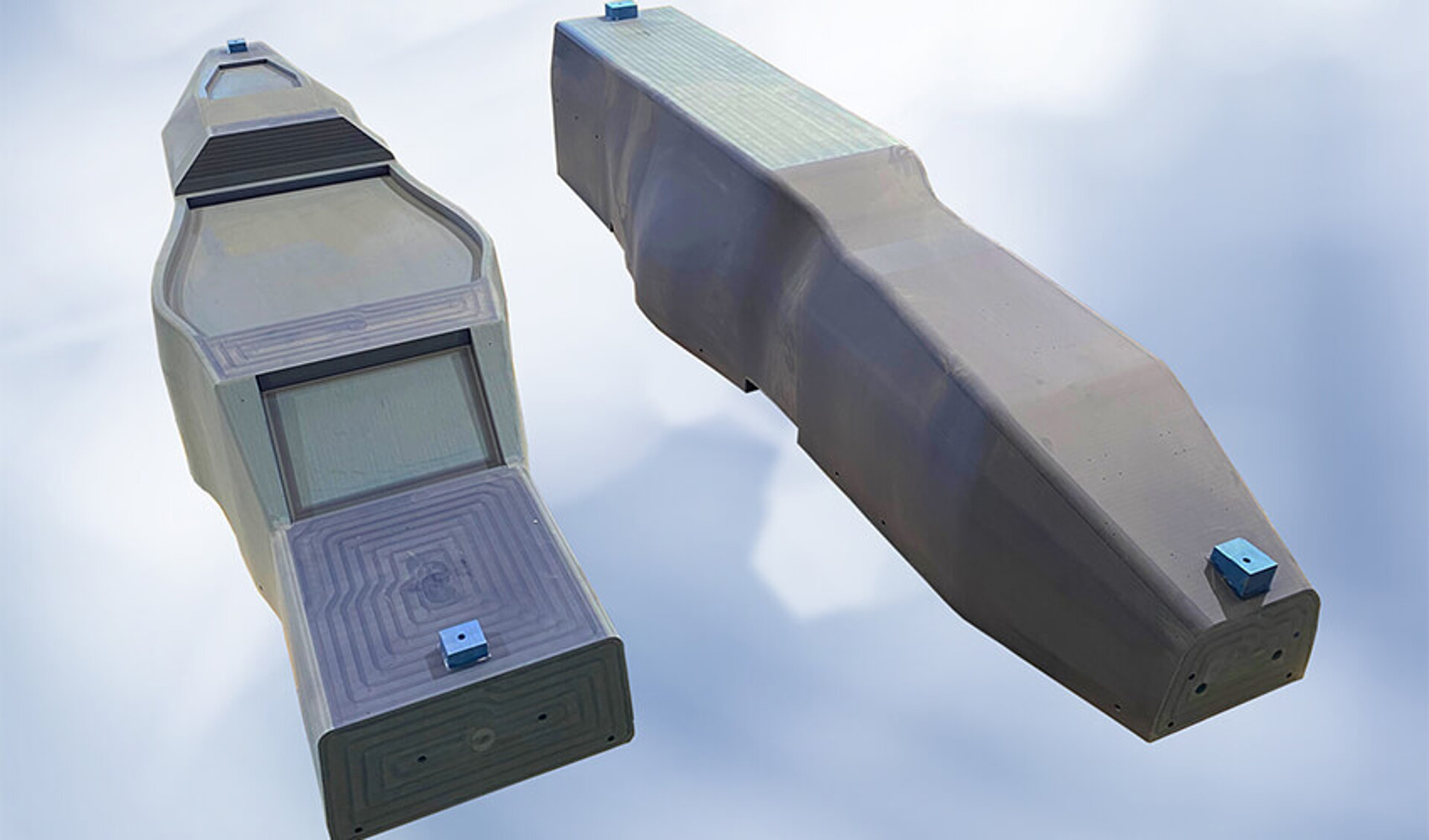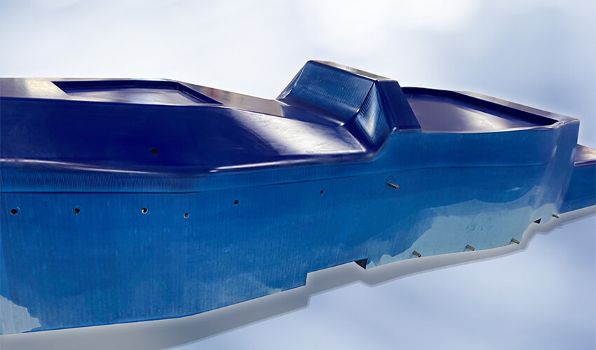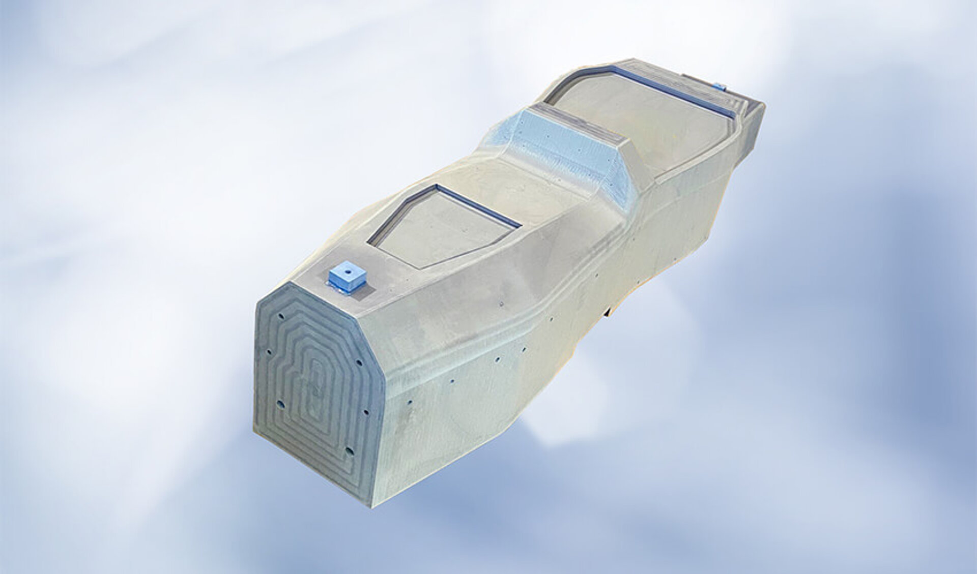 - Äußerst effiziente Technologie im Vergleich zur Plattenverklebung. Reduzierung von Materialabfall, Bearbeitungszeiten, Werkzeugverschleiß und Kosten. Die Bearbeitungszugabe beträgt nur ca. 10 mm. Dieser Unterschied wird durch die Monocoque-Geometrie mit der geteilten Verbindungslinie besonders betont.