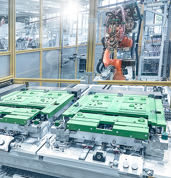 At the heart of the system is a dual sliding table that is autonomously loaded and unloaded by a mobile robot. Mounted on the table is an ultra-lightweight and extremely dimensionally stable component carrier made of RAKU® TOOL modeling materials from RAMPF Advanced Polymers, ensuring maximum process stability, efficiency, and sustainability.